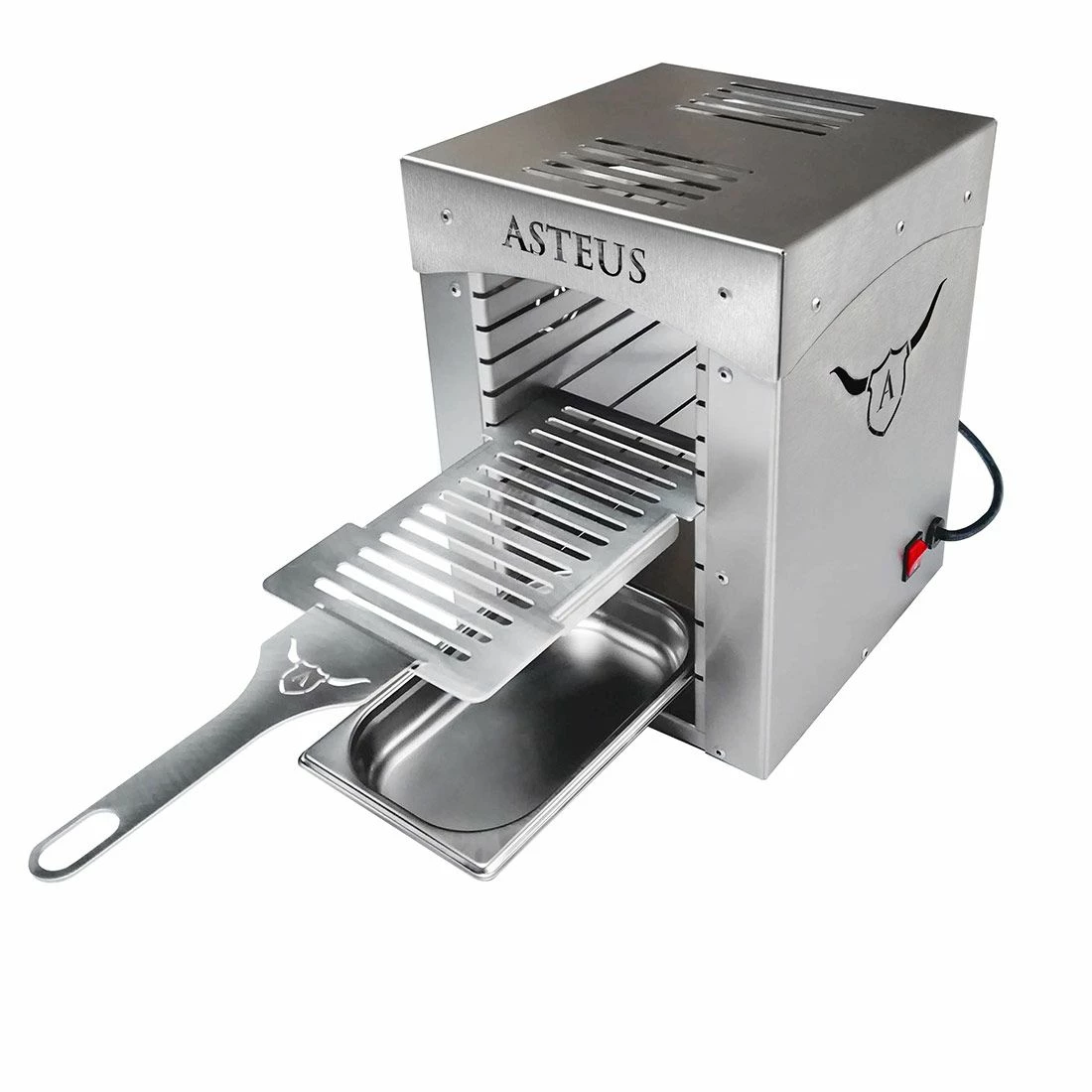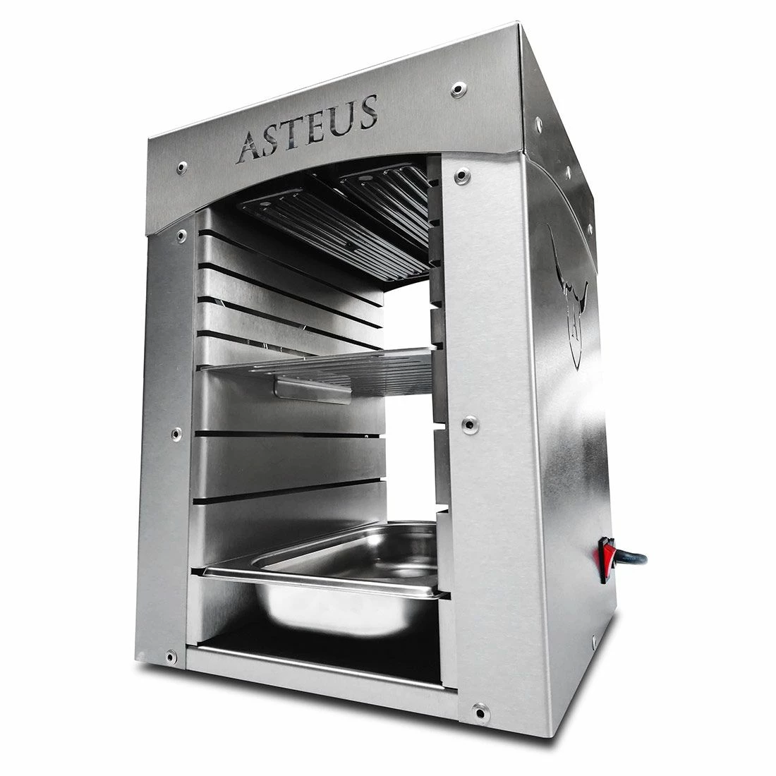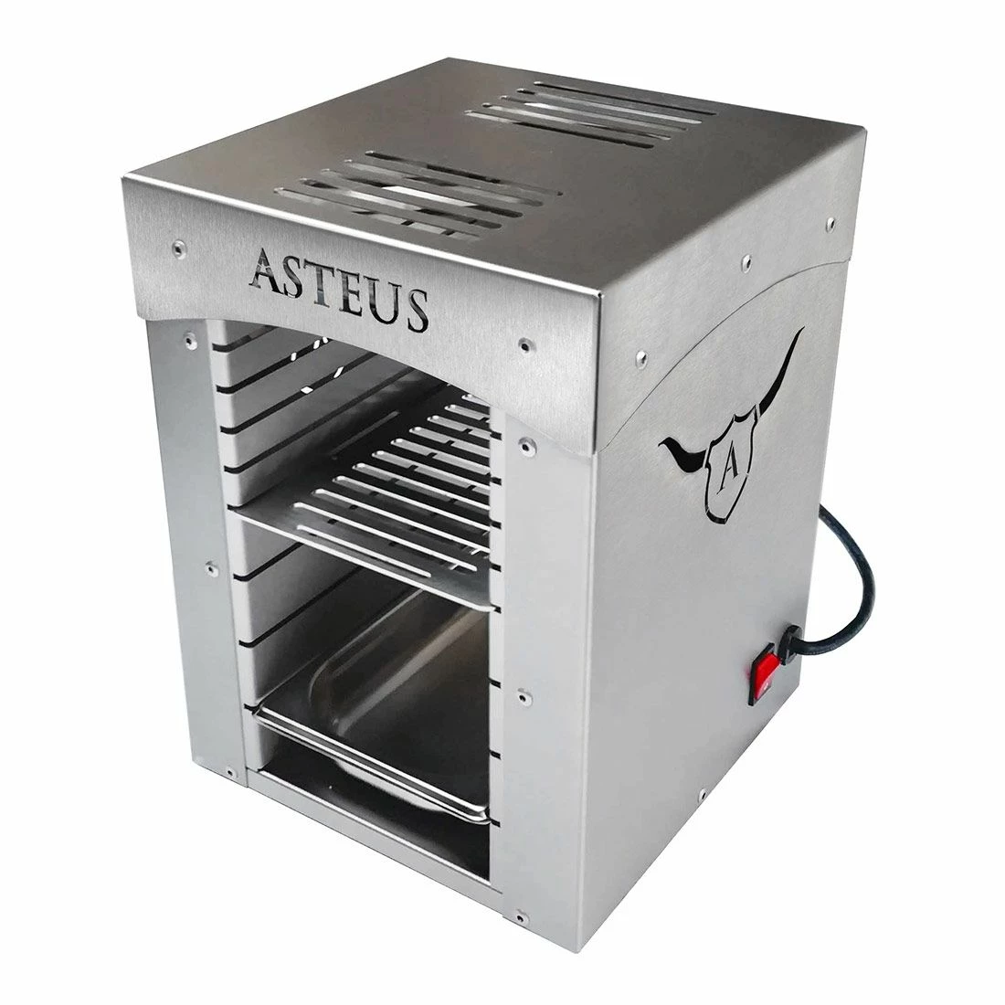 Zwei Hochtemperatur-Keramik-Infrarot-Strahler mit einer Gesamtleistung von 2400 Watt sorgen zusammen mit dem temperaturoptimierten Design des Garraumes für ausgezeichnete Grillergebnisse – zu jeder Jahreszeit. Der Asteus Steaker Junior funktioniert mit einer Haushaltsüblichen Steckdose (230 Volt) und kann daher auch im Haus verwendet werden.