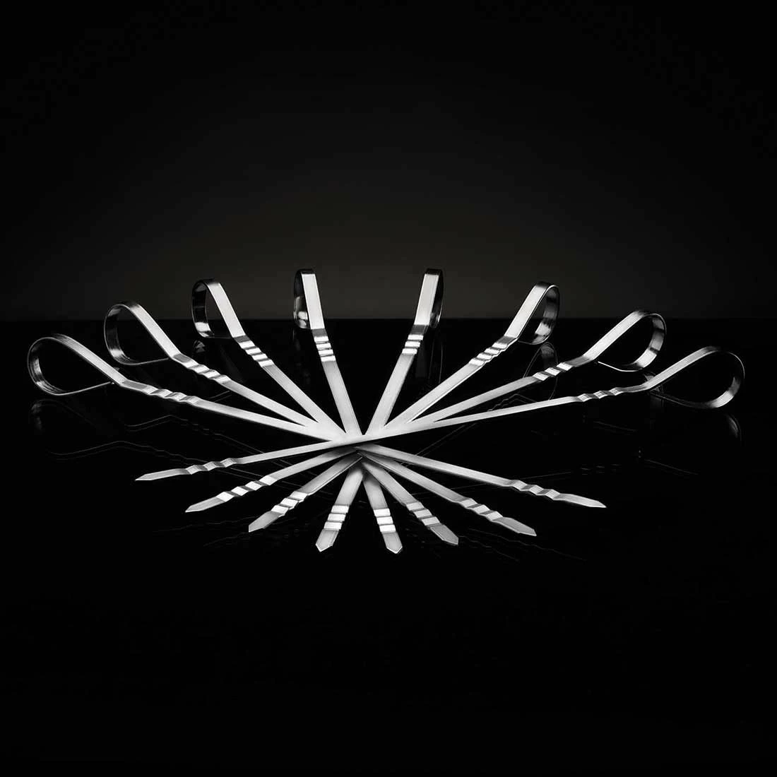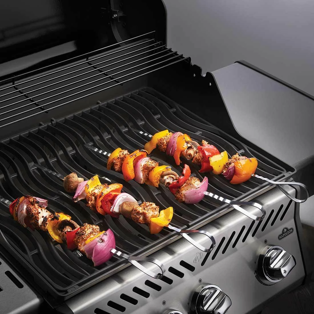 Napoleon® Set mit acht Spießen aus Edelstahl. Flach und an beiden Enden mit Wellenform. Die Spieße können für indirektes Grillen im Warmhalterost eingehängt werden. Für direktes Grillen können sie auf dem Grillrost platziert werden (33,5 cm lang). Spülmaschinenfest.