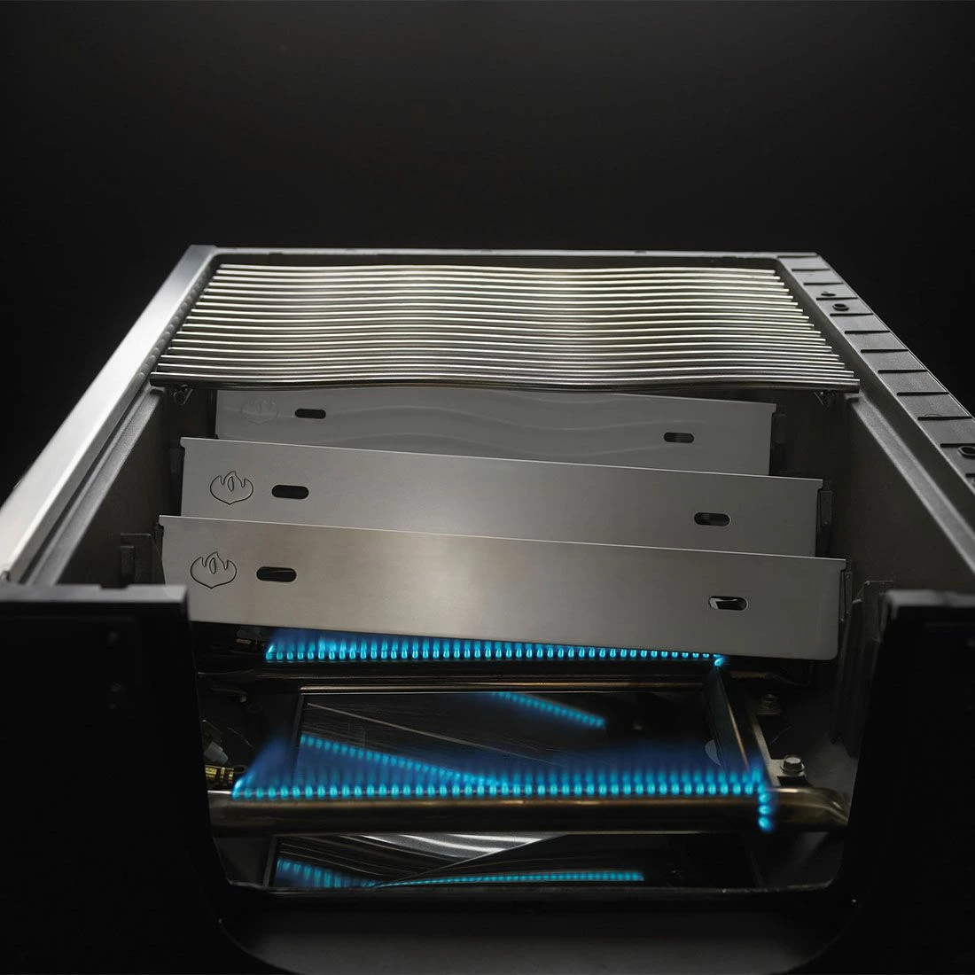 Edelstahl-Flammenschutzeinsätze bilden eine extra Oberfläche und werden so zu Aromaschienen, die dem Grillgut eine besonders aromatische Grillnote verleihen. Diese Aromaschienen sind dank des geradlinigen und durchdachten Designs besonders einfach zu reinigen.