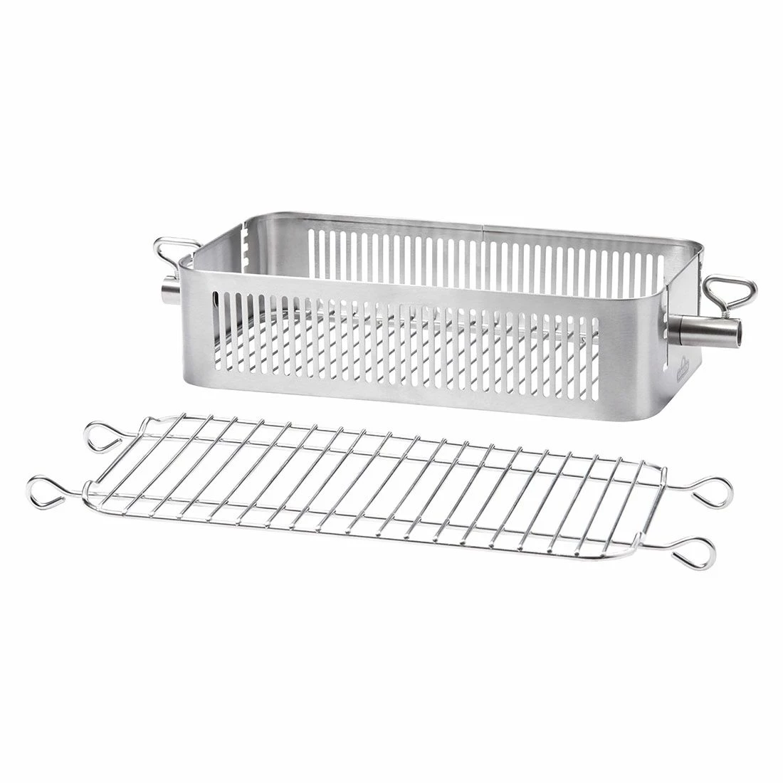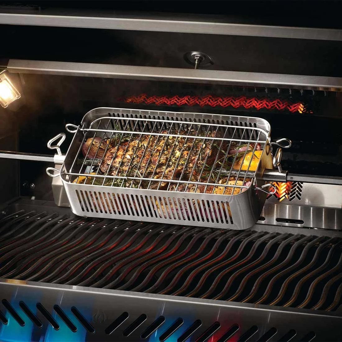 Gegrillt schmeckt einfach besser. Der Napoleon Grillkorb für Drehspieße aus Edelstahl macht das Grillen von Hähnchenflügeln, Pommes frites und vielem mehr ganz einfach. Der Anschluss ist für jeden Napoleon Drehspieß geeignet und der Korb wird mit zwei Stellschrauben befestigt. Nachdem Sie die köstlichsten Hähnchenflügel, leckere Pommes frites oder gegrilltes Gemüse ohne Öl zubereitet haben, lasst sich der Grillkorb einfach reinigen und aufräumen.