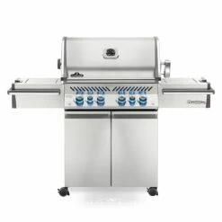 In der robusten und langlebigen Aluguss-Grillkammer fungieren Flammenschutzeinsätze gleichzeitig als zweistufige Aromaschienen, die abtropfende Fleischsäfte in Aromaspender für das Grillgut verwandeln. Auf der 71 x 46 cm großen Hauptgrillfläche sorgen 9,5 mm dicke WAVE™ Edelstahl-Stabgrillroste für das typische und beliebte Napoleon-Branding. Die beidseitigen Ablagen halten nebst Seitenbrenner und Zubereitungsfläche auch ein Fach für kühle Getränke mittels Crushed Ice und ein integriertes Schneidebrett, verchromte Handtuchhalter, Besteckhaken und Gewürzablagen bereit. So sind Grillzange und anderes Grillzubehör stets zur Hand. Sollte das Grillvergnügen mal etwas länger dauern, ermöglichen die neuen SAFETY GLOW™ Drehregler mit integrierter Hintergrundbeleuchtung, die sich von blauem auf rotes Licht ändert, wenn Gas strömt, auch bei Dunkelheit eine präzise Bedienung. Die platzsparende LIFT EASE™ Rollhaube mit ACCU PROBE™ Thermometer lässt sich kinderleicht anheben und macht auch geöffnet eine schlanke Figur.