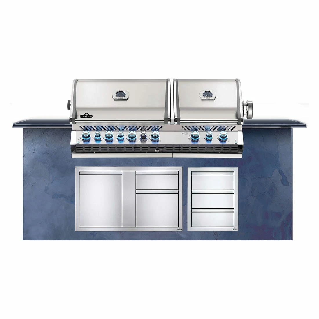 Stellen Sie sich vor, Sie vollenden Ihre Outdoorküche mit dem perfekten Grillaufsatz: dem Napoleon Prestige Pro 825 mit Infrarot-Heckbrenner. Dieser Einbaugrillaufsatz bietet alles, was Sie für professionelles Grillen benötigen: zwei getrennte Grillbereiche und die spezielle SIZZLE ZONE™ Area mit Temperaturen von bis zu 800 °C für perfekte Steaks. Insgesamt finden rund 50 Burger Platz am WAVE™-Grillrost. Zusätzlich bieten die Warmhalteroste entlang der beiden Grillflächen Platz für zusätzliches Grillgut.