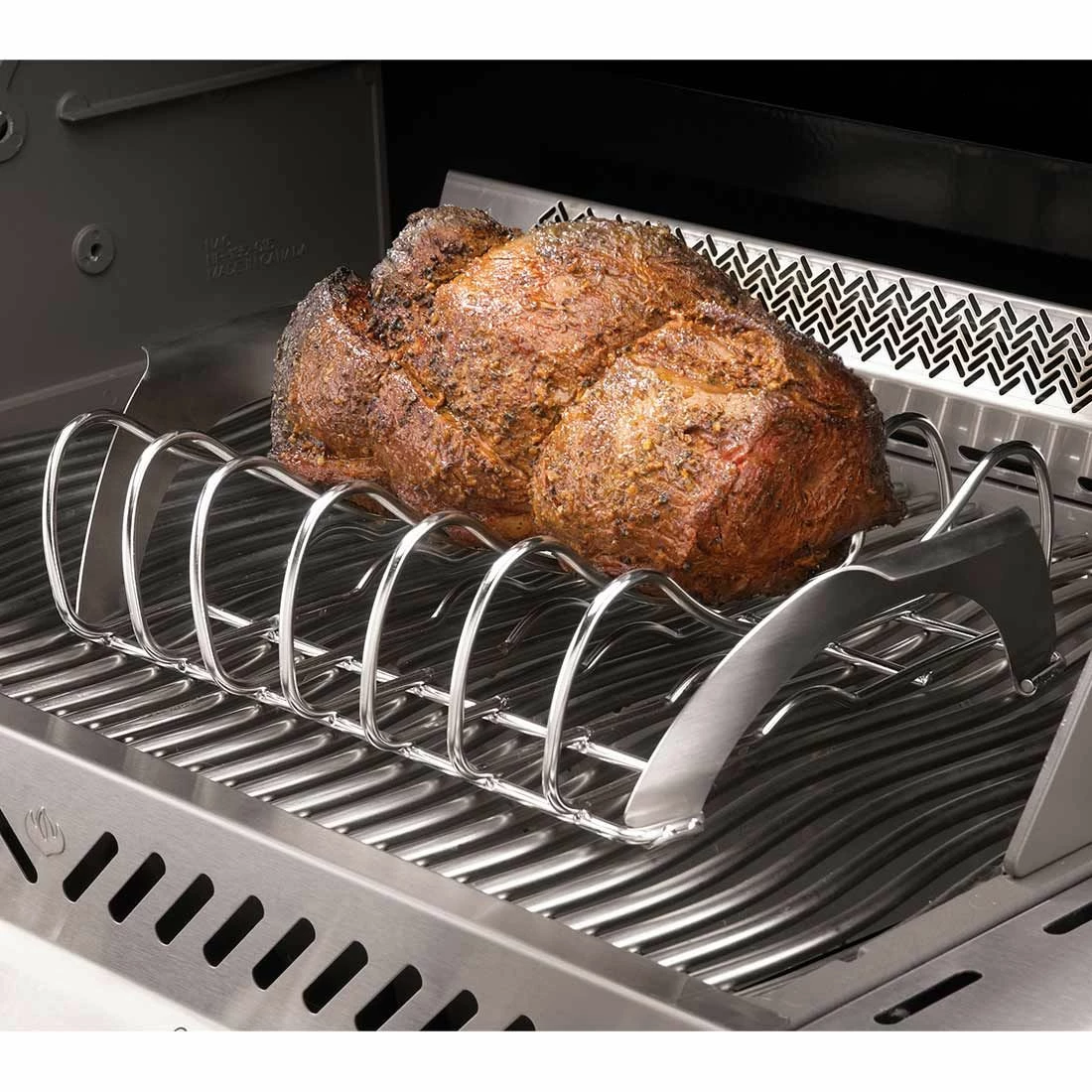 Napoleon® PRO Spare-Ribs- und Bratenhalter mit seitlichen Griffen und massiven Edelstahl-Spangen.