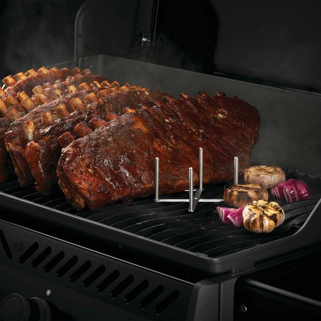 Grillen Sie saftige Spare-Ribs und riesige Bratenstücke mit dem Napoleon Spare-Rib-Halter mit seitlichen Griffen aus hochwertigem Edelstahl.