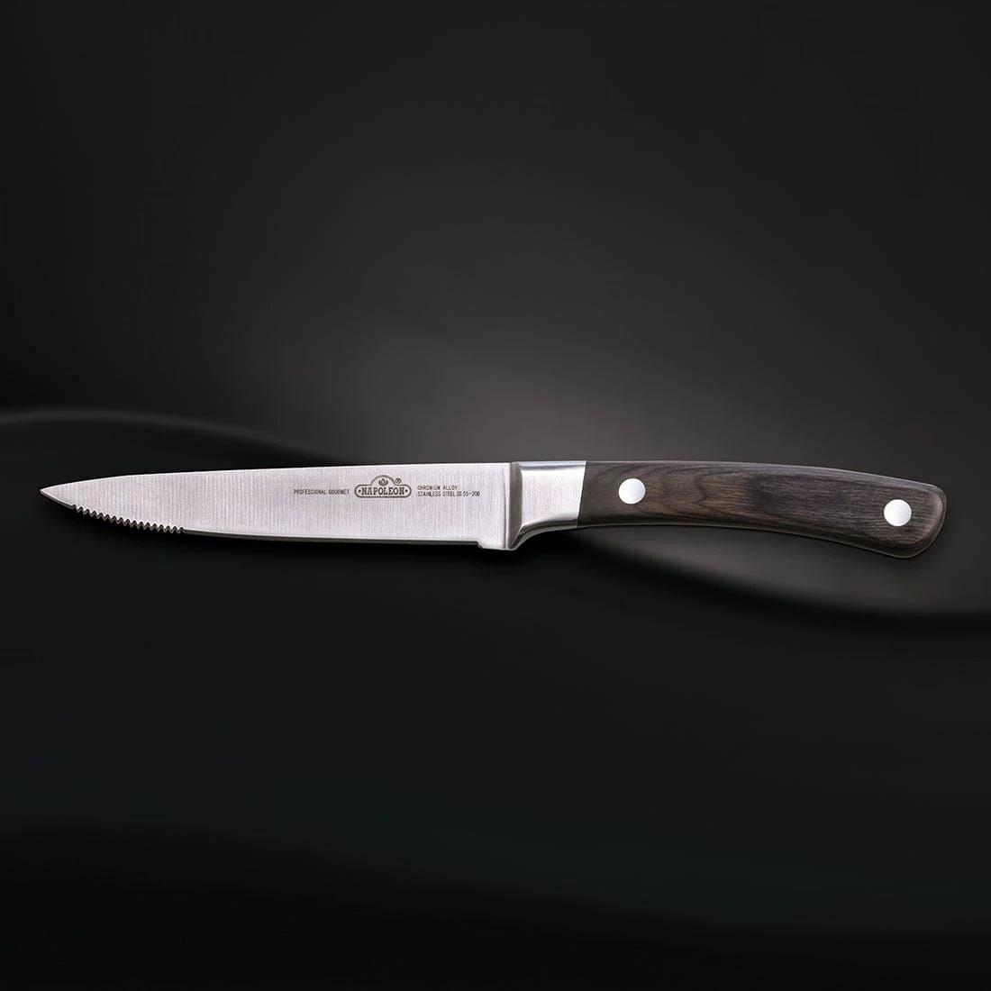 Das Napoleon® Steakmesser mit genietetem Rosenholzgriff gleitet mit seiner 12,7cm langen Klinge mühelos durch dicke Steaks. Das Messer ist robust geschmiedet sowie ideal ausbalanciert und besticht durch sein klares Design.