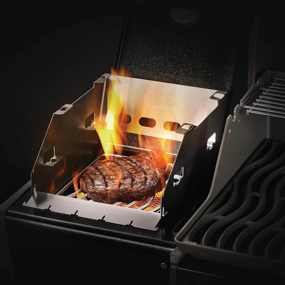 Multifunktionaler Napoleon® Windschutz. Dadurch brennt die SIZZLE ZONE™ auch bei stärkerem Wind stabil. Der Grillrost kann in drei weitere Positionen verstellt werden. Die vordere Blende ist klappbar, so dass der Zugang mit der Grillzange erleichtert wird. Zudem ist eine Spieß-Halterung integriert, die es ermöglicht über der SIZZLE ZONE™ Grillspieße ohne direkten Kontakt zum Rost zu grillen. Für Napoleon® RXT-Serie geeignet.